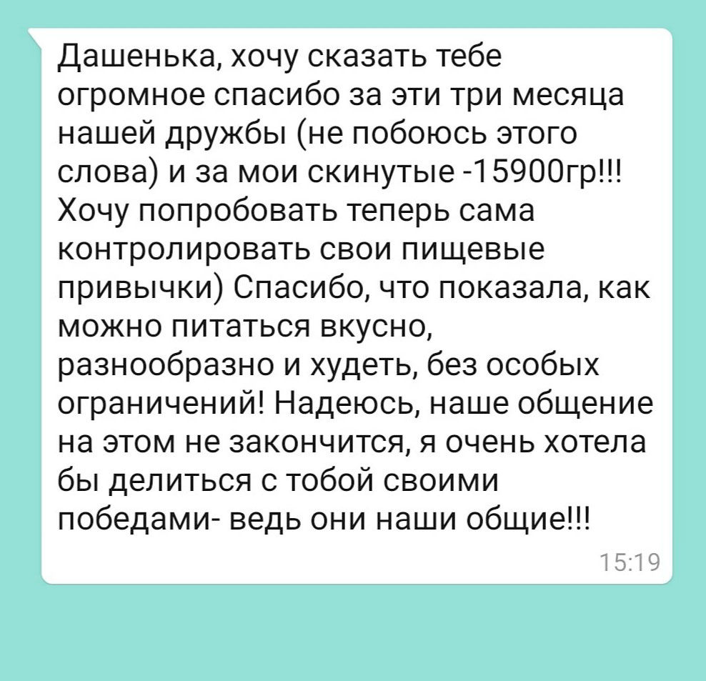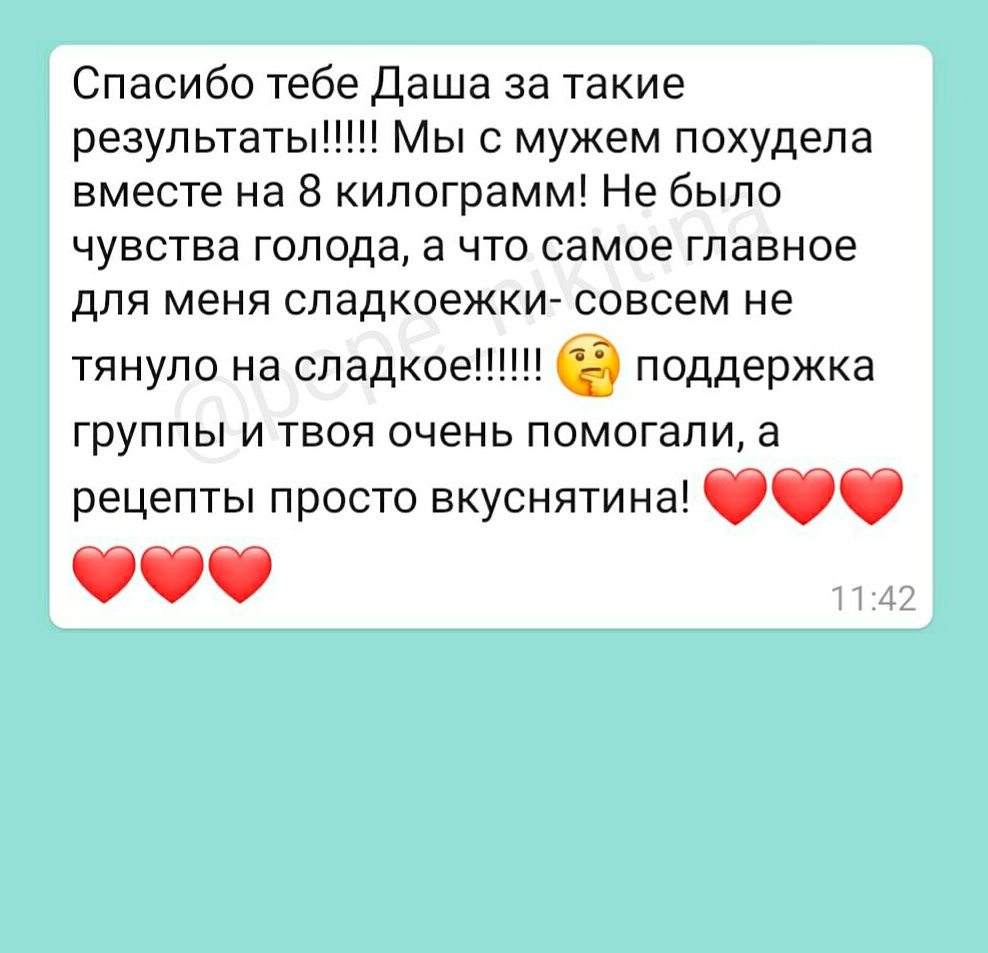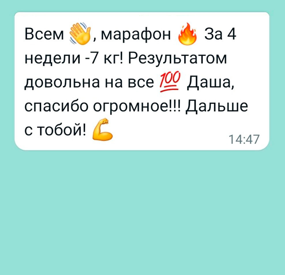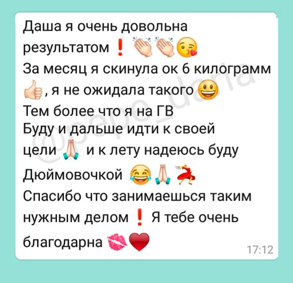 Мне 35 года, мама двух замечательных мальчишек (10 и 7 лет). После 2х родов мой вес был 76 кг, а сейчас мой вес 56. 6 лет назад я написала свою авторскую программу похудения, на основании которой провожу онлайн-марафоны #жирубой. Соблюдая мои рекомендации, похудели уже тысячи девушек! После марафона они самостоятельно научились выстраивать себе питание на всю жизнь, так как я даю все необходимые для этого знания и рекомендации.